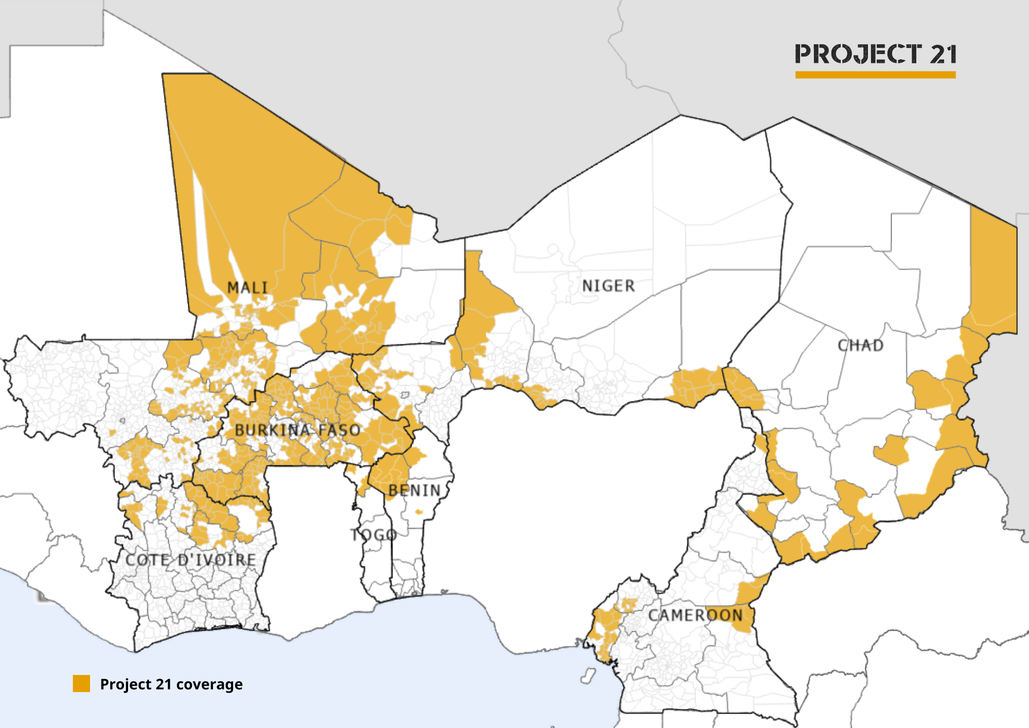 Since the start of the project in 2021, geographic coverage and volume of data collection have significantly increased. Project 21 is fully rolled out in the Central Sahel and Chad. In 2023, partners gathered data from 2,500 communities, conducting more than 25,000 interviews. More recently, P21 tools have also been introduced in Cote d’Ivoire and Benin, and are planned to start in Mauritania.